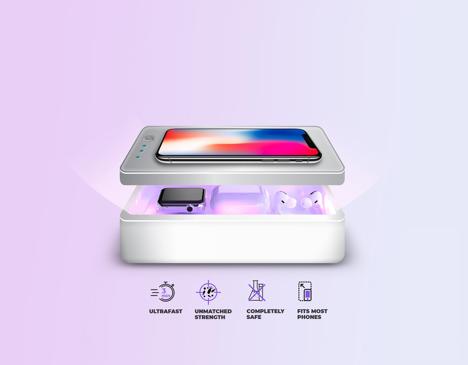 The UV Box comes with a 10W wireless charger for your convenience.Quick charge your phone for all Qi-enabled devices for efficiency!