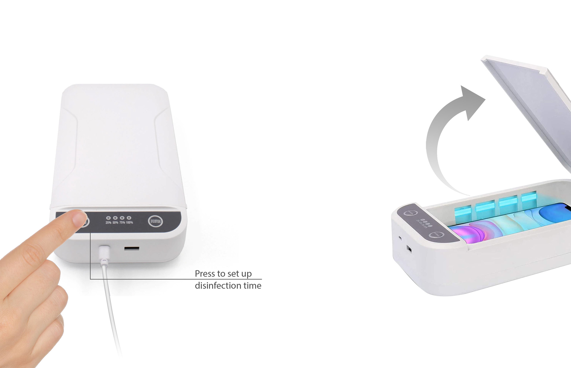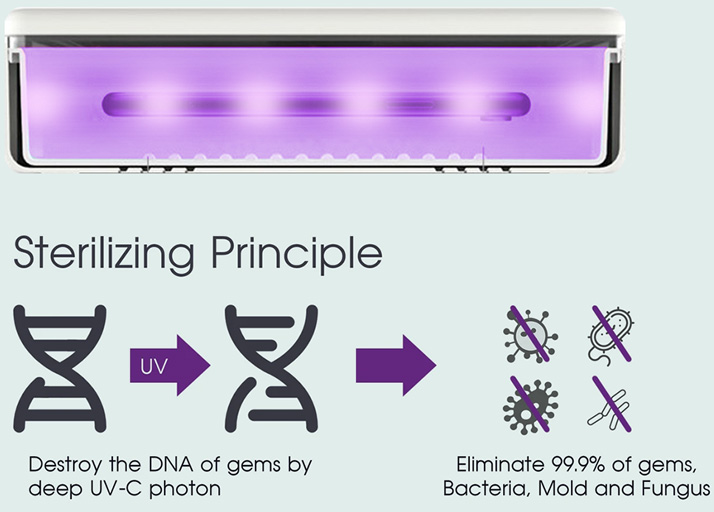 Press the button on the top for your desireddisinfection time. (1 second for 3 minutes,