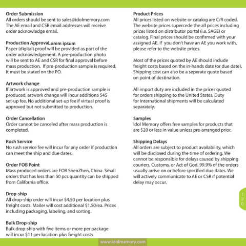 All orders should be sent to sales@idolmemory.com All prices listed on website or catalog are C/R coded.