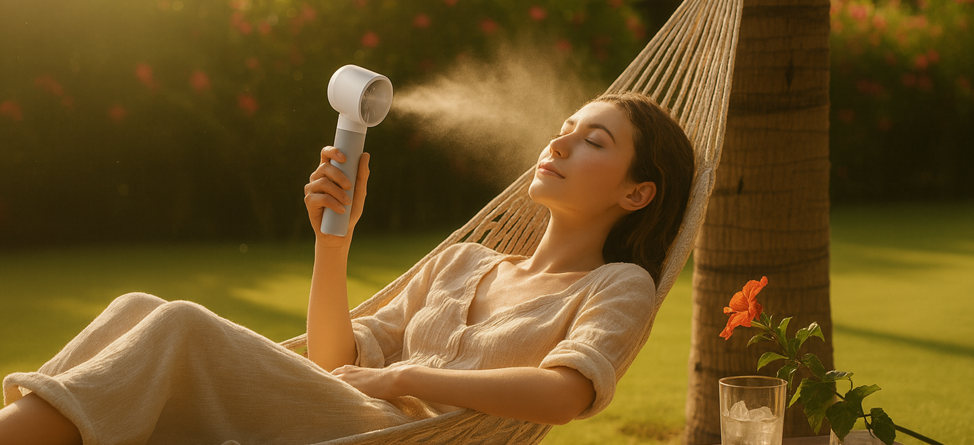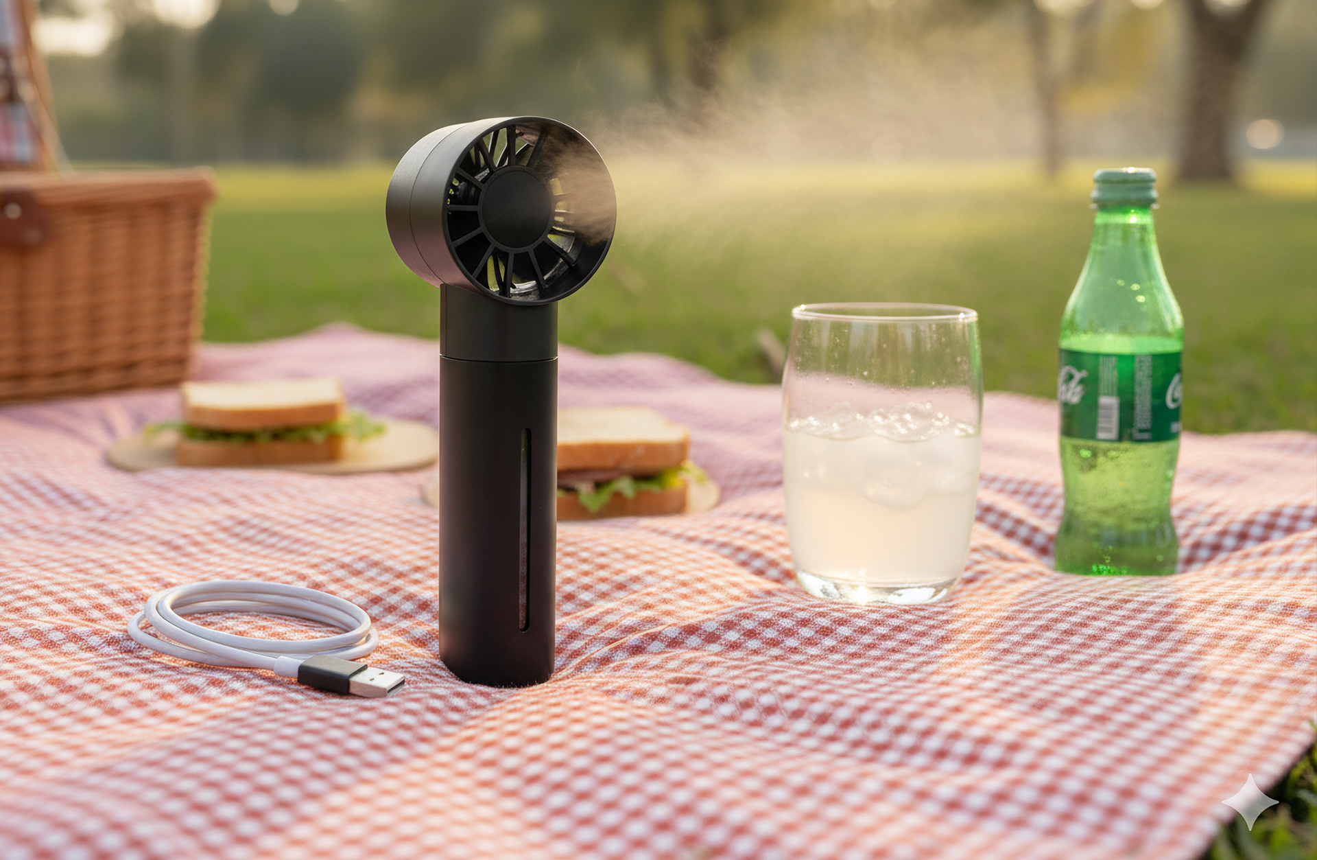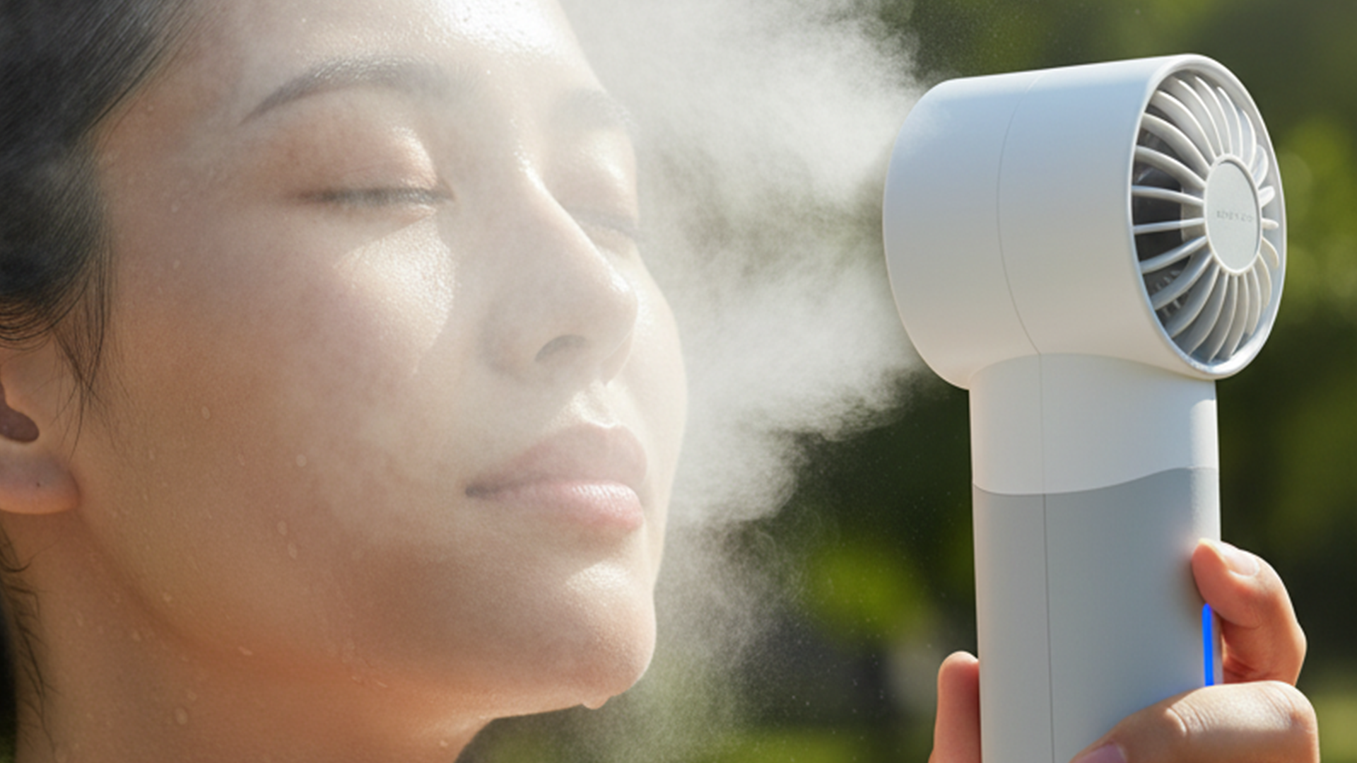 Use fan alone or with mist for extra cooling. The mist is on automatically if water is in the tank. Show adding water from the bottom of the fan.